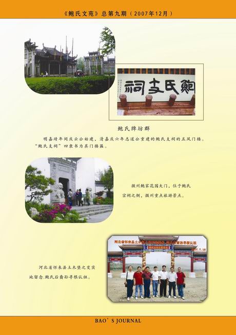 鲍氏文苑第九期封底 介绍棠樾鲍氏支祠、牌坊群、鲍氏花园和怀来土木之变遗址寻根之旅。