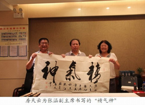 鹤岗市政协副主席张涵夫妇、市纪委副书记兼监察局长陈鸿女士、安监局副局长张玉仁先生为房天云书赠房泽刚的书法见证