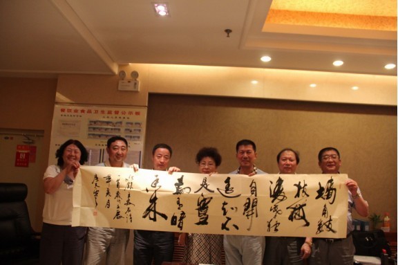 当晚,鹤岗市政协副主席张涵夫妇、市纪委副书记兼监察局长陈鸿女士、鹤岗安全生产监督管理局副局长张玉仁先生代表地方政府宴请了联合考察团一行,他们对房泽刚企业的经营成就表示一致肯定,并集体欣赏了著名书法家房天云即兴创作的书法作品。为表达对房氏热心、优秀企业家房泽刚先生的感谢,著名书法家房天云以北宋政治家、文学家王安石《梅花》一诗(墙角数枝梅,凌寒独自开。遥知不是雪,为有暗香来。)为内容,特别为房泽刚挥墨书写了一幅长卷。