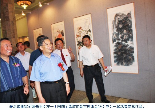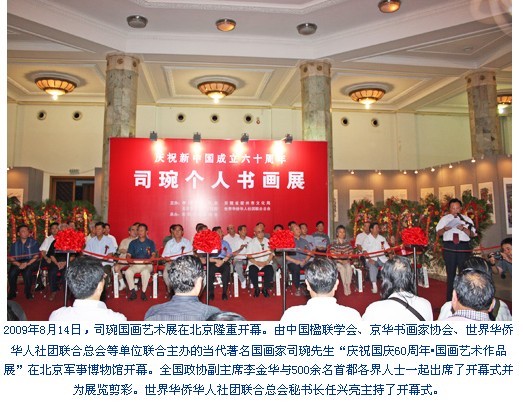 由世界华侨华人社团联合总会、京华书画家协会、北京世界华人文化院、安徽省宿州市文化局联合主办的十大杰出艺术家、著名花鸟山水画家司琬国画作品展,8月14日上午十点在北京军事博物馆展出,展出至18号结束。 全国政协副主席李金华等领导出席了开幕式并为画展剪彩,世界华侨华人社团联合总会秘书长任兴亮主持了开幕式。来自全国人大、政协、国务院系统的领导和老干部及500余名首都各界人士前来参观。
